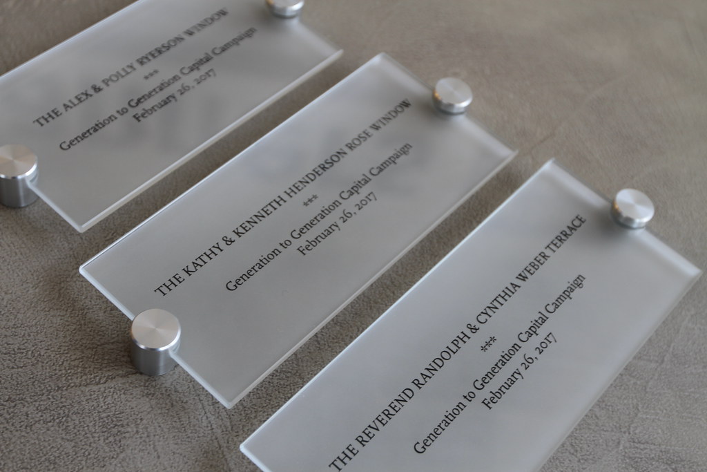 Etched glass signs are produced by sandblasting the surface of Jade or low-iron clear glass to create a frosted, semi-opaque design. Lettering and logos are often etched and paint-filled in metallic or brand colors. These signs offer a clean, high-end look and are commonly used in lobbies, conference rooms, donor walls, and memorials.