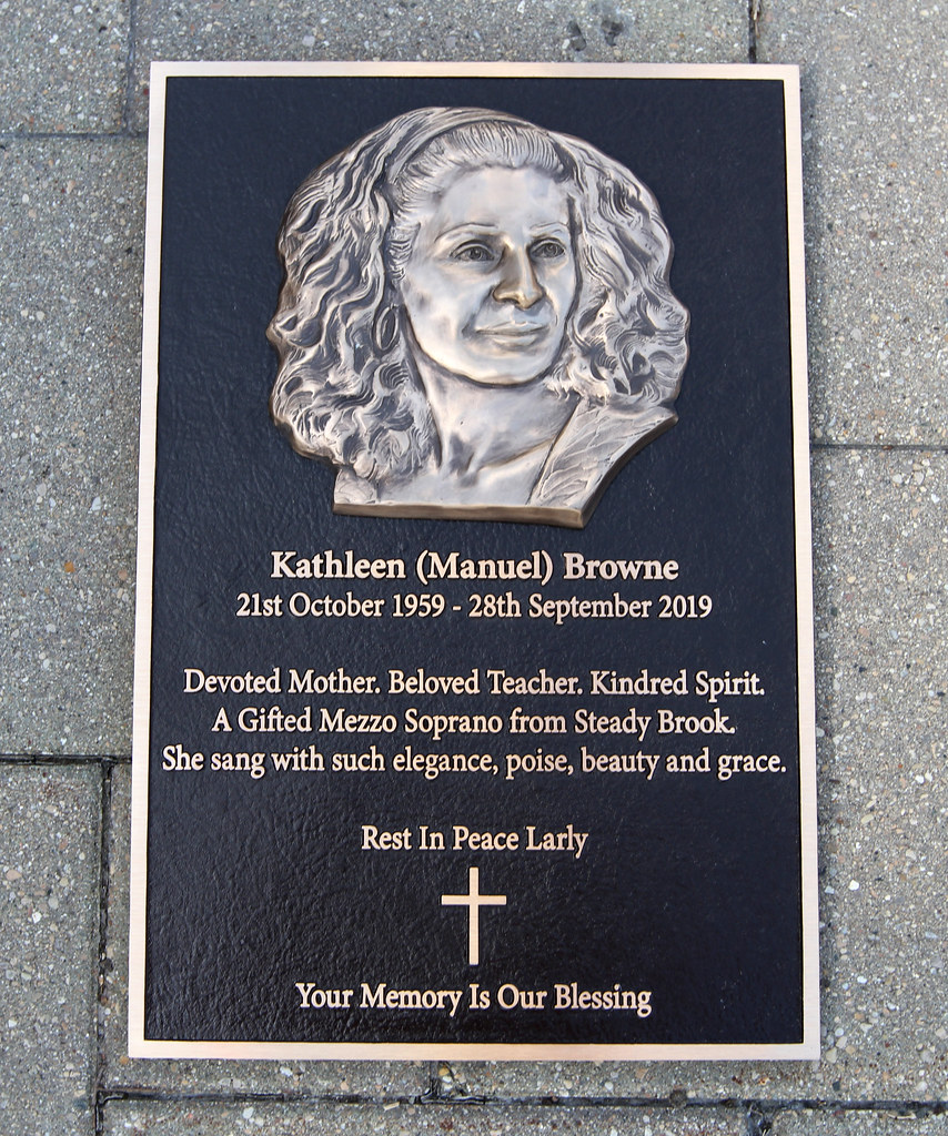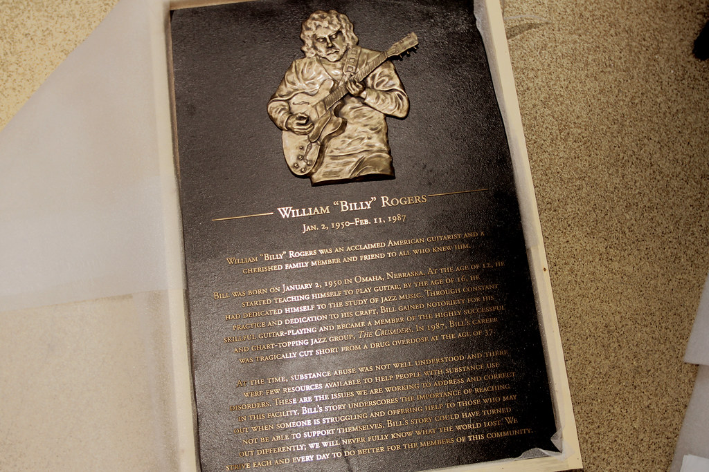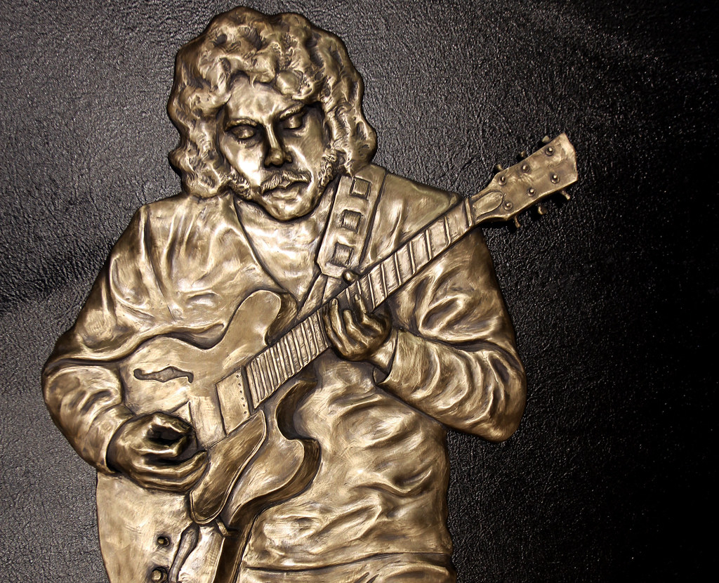 Detailed Bas relief of man with guitar on bronze memorial plaque