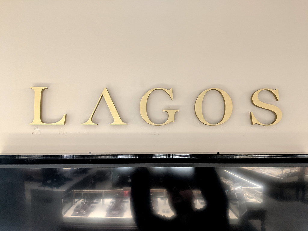 48" wide 1/4" thick Brushed Brass logo and lettering for interior insurance company lobby sign Installed on custom layered wall panels