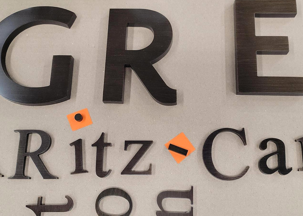 20.0 inch Height Cut 1/4" thick Aluminum Letters Black Anodized Brushed Finish Stud and Spacer mounting FONT: Garamond Regular