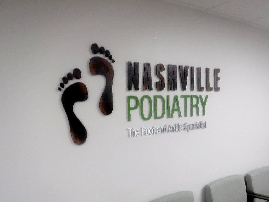 Overall 60" wide 1/4" thick solid corten steel Feet Logo & NASHVILLE with PODIATRY painted SW6720 aluminum and tagline brushed aluminum natural finish Includes stud mounts installation template and Spacers to "float" your letters